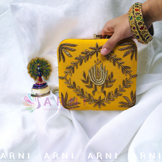 Cartera de color amarillo con bordados a mano dorados