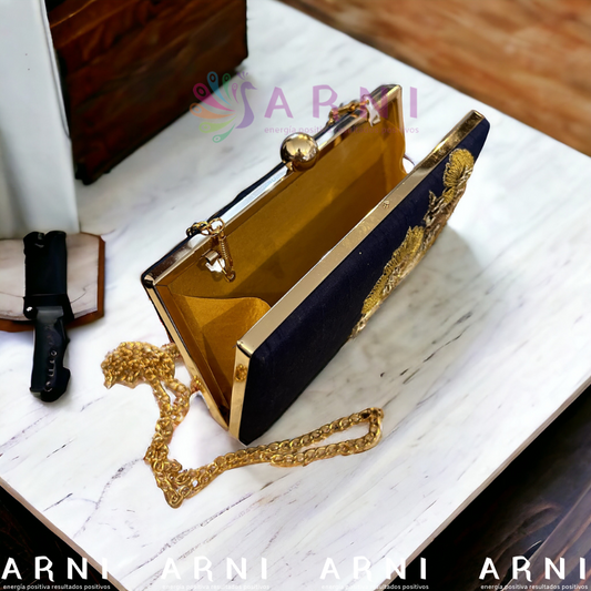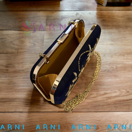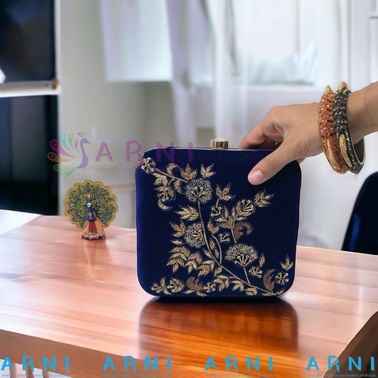 Cartera de color azul con bordados a mano dorados