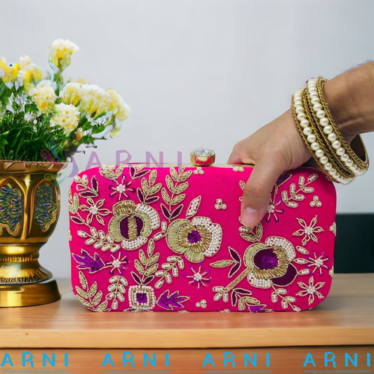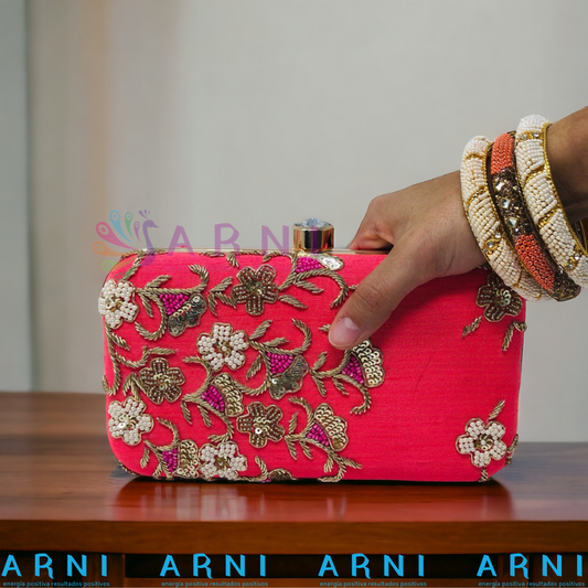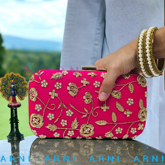 Cartera de color fucsia con bordados a mano