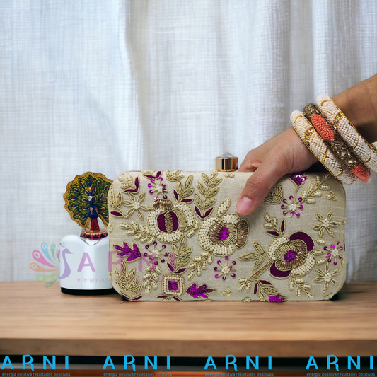 Cartera de color bige con aplicaciones fucsia con flores