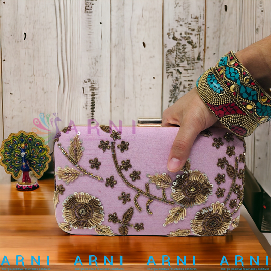 Cartera de color violeta con flores bordadas a mano